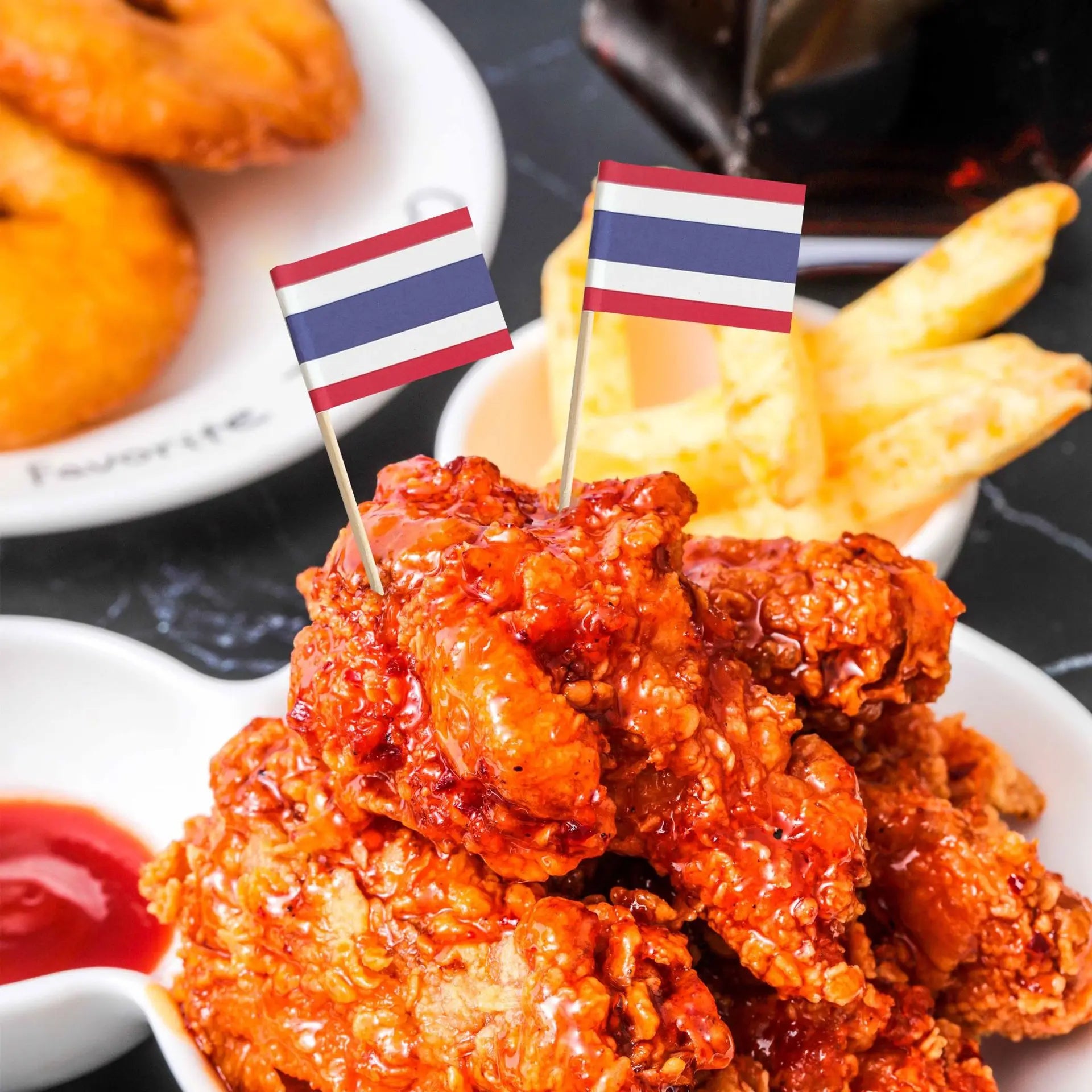 - Colorful flag designs — Adds visual interest and helps identify different foods